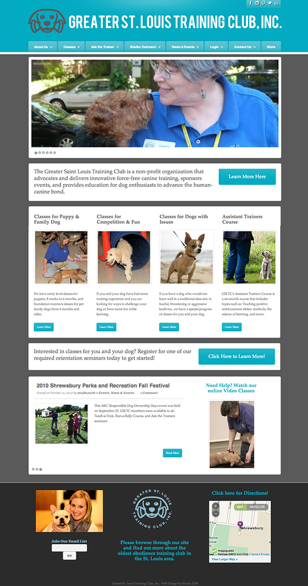 Studio 2108 just wrapped up a WordPress website for the Greater St. Louis Training Club, Inc. The Greater Saint Louis Training Club is a non-profit organization that advocates and delivers innovative force-free canine training, sponsors events, and provides education for dog enthusiasts. We had such a great time creating this site, and took advantage of all of WordPress’s great features to make this site as user friendly as possible so our clients can make updates and edits to almost any area of the website.